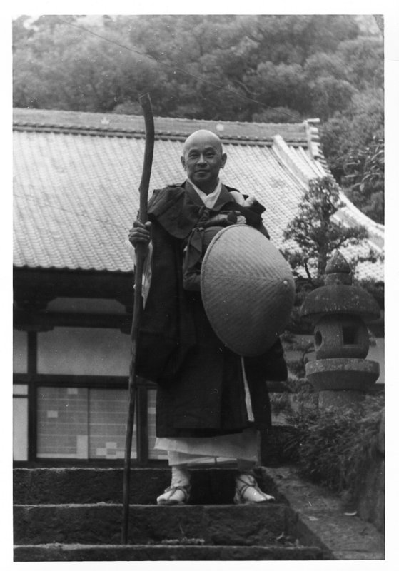 SR0073: 1966-10-23 *Shunryu Suzuki: second takuhatsu after stepping-down ceremony at Rinso-in. 1983 WB (No. 1), p. 4, states that the photo was taken at the garden of Rinso-in 'before coming to the USA' [sic] Wonder what "2nd takuhatsu" means. - dc