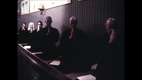 Student, water, kettle, and Veggie Misc from Outtakes - Sitting holding chant cards on the left side of right isle is Mel, Angie, Steve Brown?, Roovane on the right front, not sure about most people, there's a close-up of Meg again, then Reb hitting clackers for meal chant, Mel, DC, Jerry Halpern (still), Roovane in garden - is that Leith? Walter with white hair?, Dianne (Daya) Goldschkag on bell, DC walks up to her, Jack Elias cutting veggies, long hair guy, long hair woman, unknown two by coffee/tea area, Reb's turn to hit the bell.